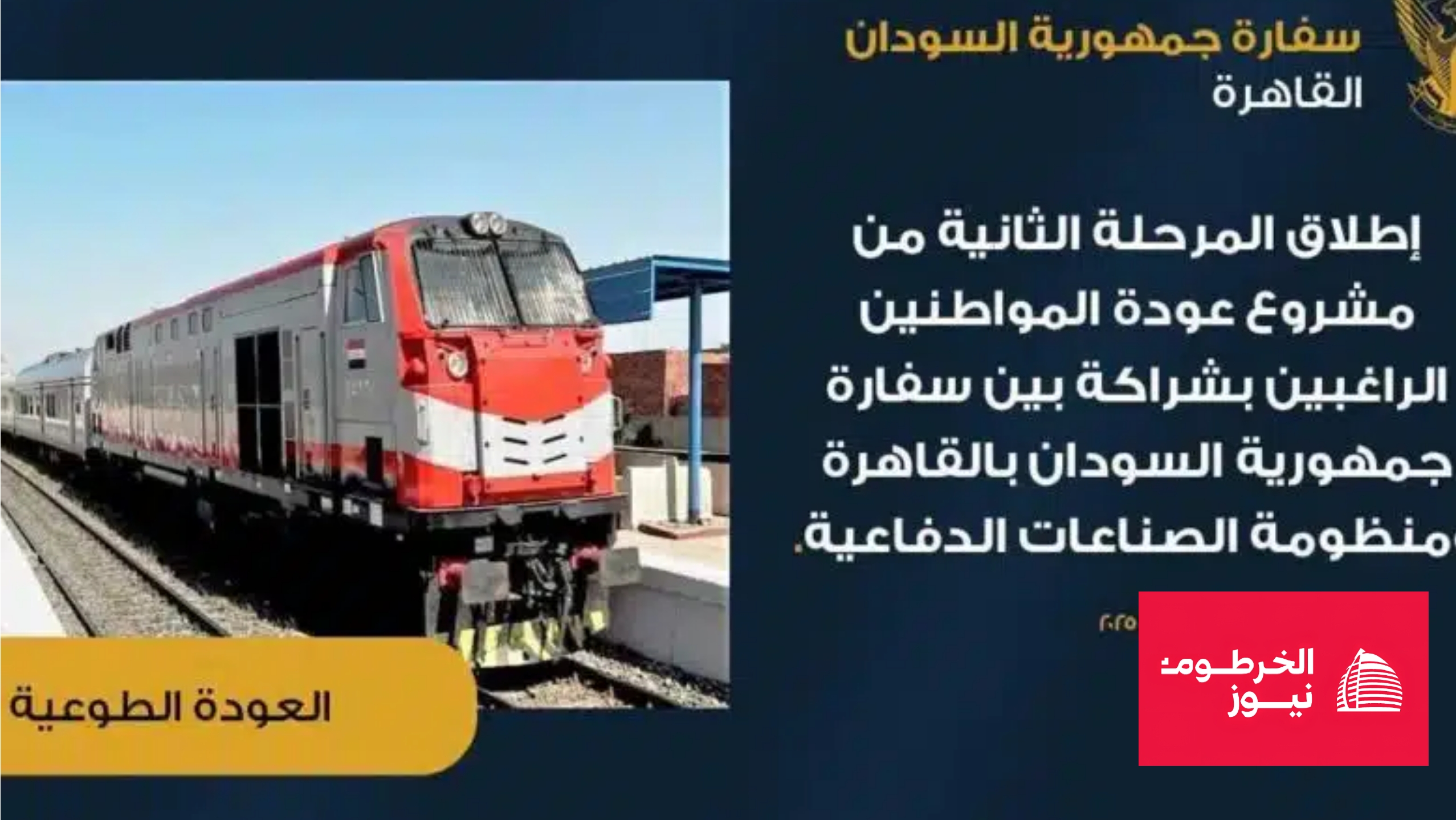 في تطور لافت لمشروع العودة الطوعية، أعلنت سفارة السودان بالقاهرة عن تدشين مرحلة جديدة من التفويج الجماعي للسودانيين الراغبين في العودة إلى الوطن، مع تغيير وسيلة النقل من الأتوبيسات إلى القطارات، بهدف توفير راحة وتنظيم أكبر للمسافرين.