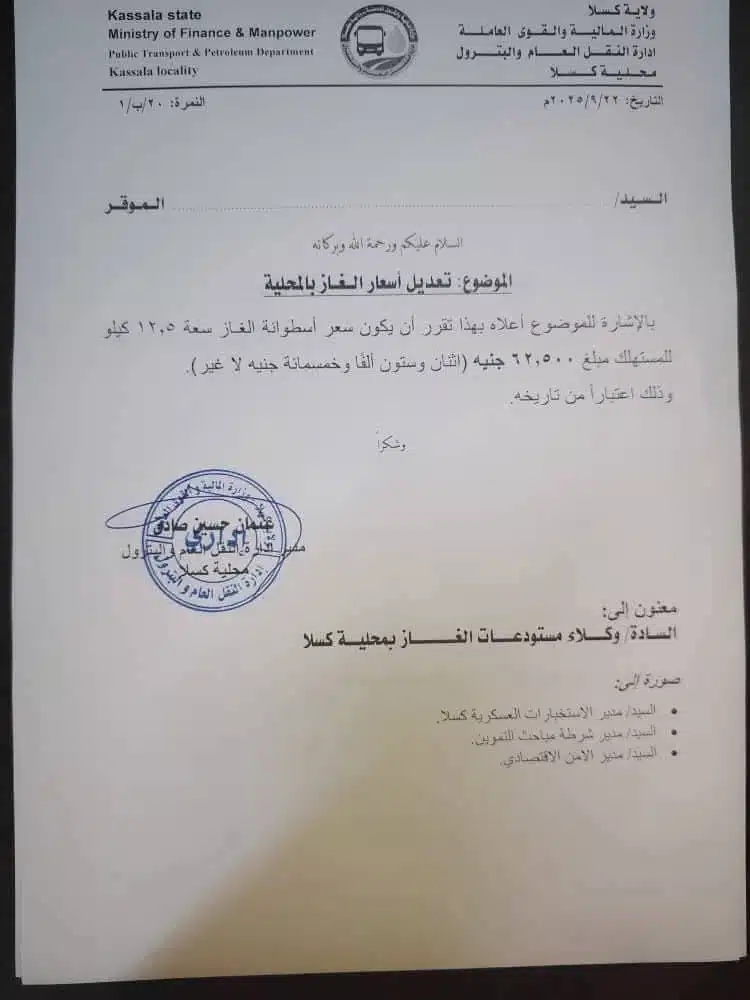 أصدرت إدارة النقل العام والبترول بمحلية كسلا قرارًا رسميًا يقضي بتعديل سعر أسطوانة الغاز سعة 12.5 كيلوغرام للمستهلك، ليصبح 62,500 جنيه سوداني. يسري هذا السعر اعتبارًا من اليوم الإثنين، 22 سبتمبر 2025، ويأتي في إطار جهود السلطات لتنظيم السوق والحد من التلاعب في الأسعار.